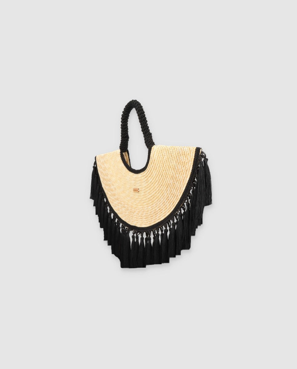 El bolso Nanai es un bolso además de una pieza de arte que deslumbrará donde vayas. Realizado con paja de trigo y con una forma de media luna. Todo su perimetro esta bordeado con borlas negras al más puro estilo español.