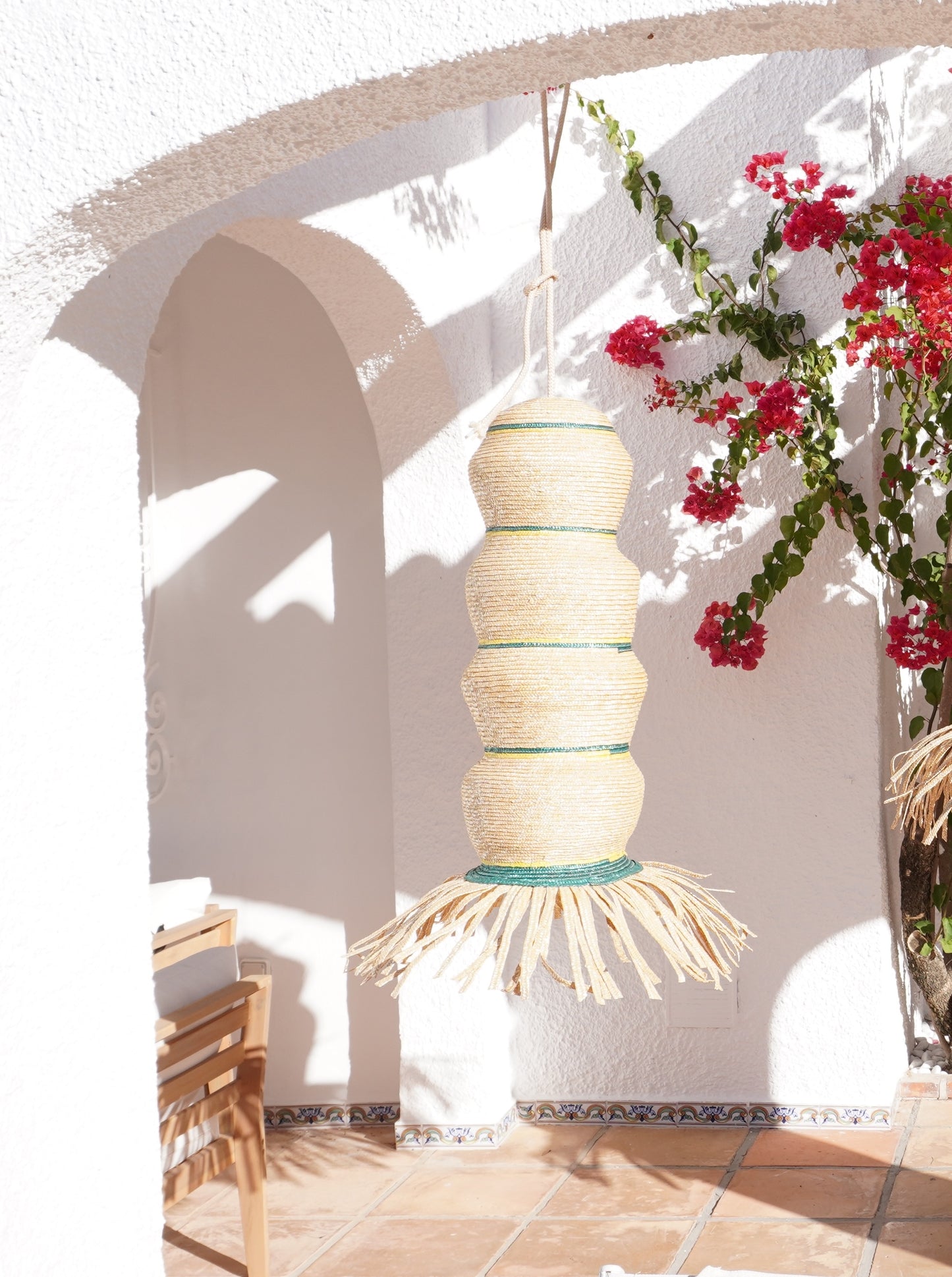 La pantalla de lampara de paja Bomba, esta diseñada y confeccionada en nuestro taller de Gata de Gorgos.