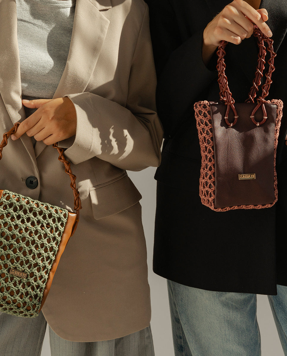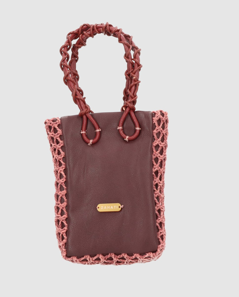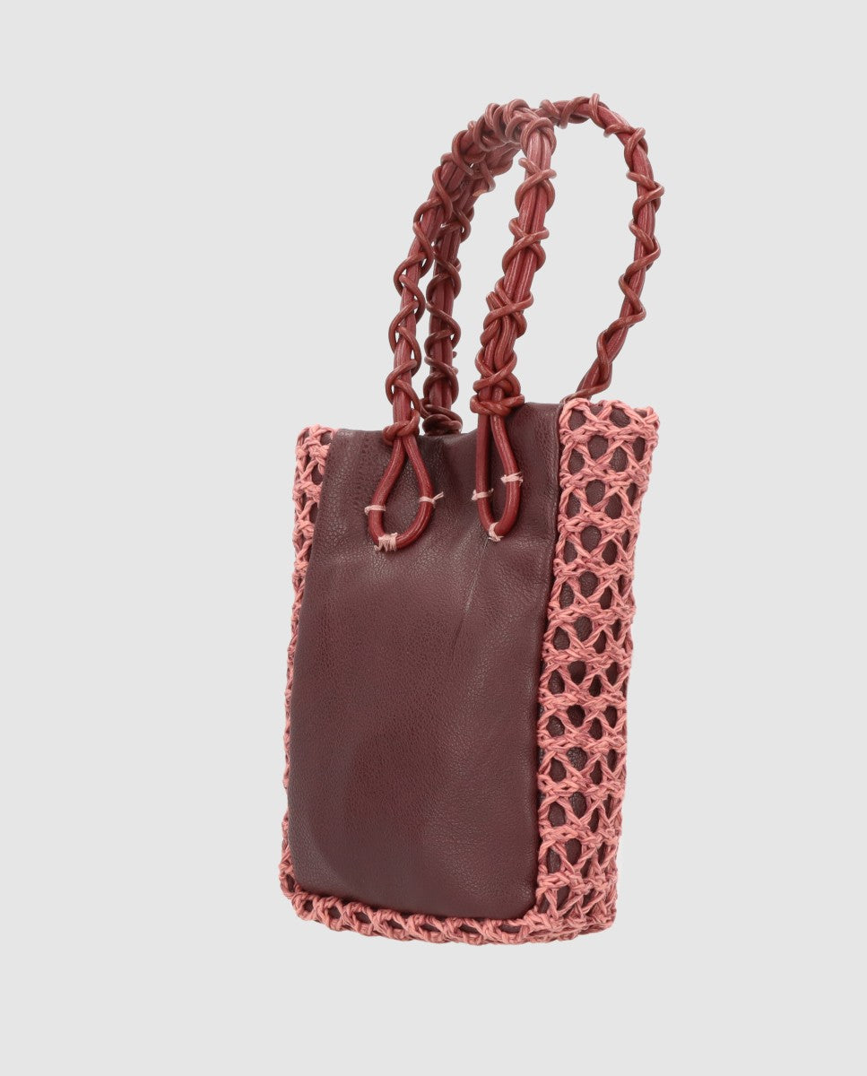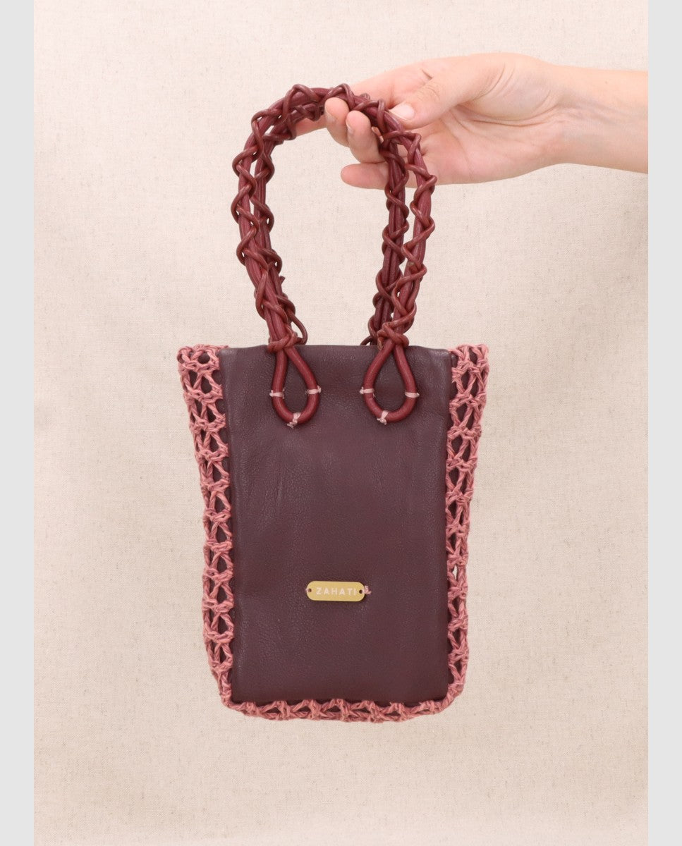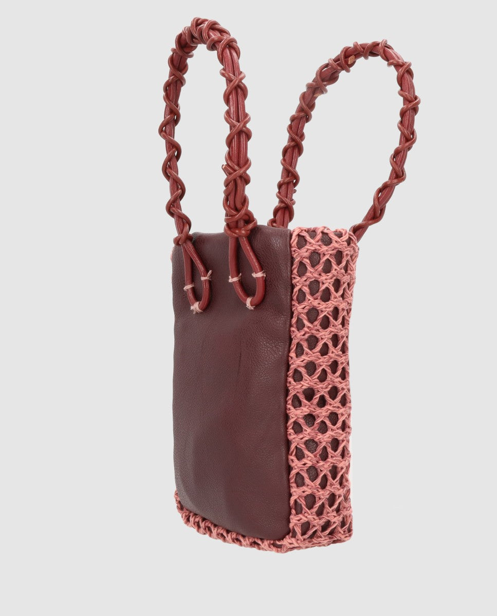 Il est confectionné en cuir écologique bordeaux et les côtés sont recouverts d'un filet de fibres naturelles assorties. La poignée est tressée à la main en cuir.