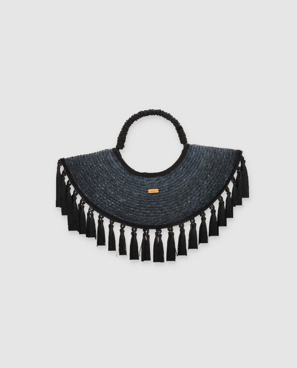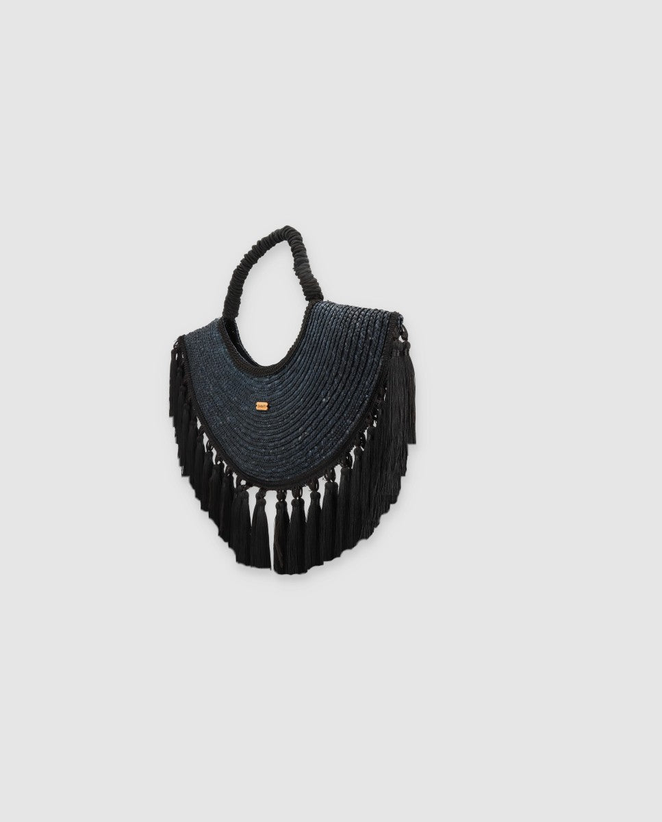 El bolso Nanai es un bolso además de una pieza de arte que deslumbrará donde vayas. Realizado con paja de trigo y con una forma de media luna. Todo su perimetro esta bordeado con borlas negras al más puro estilo español. Ideal tanto para look de invitada como para la feria.Incluye un cordón para que te lo puedas colgar.