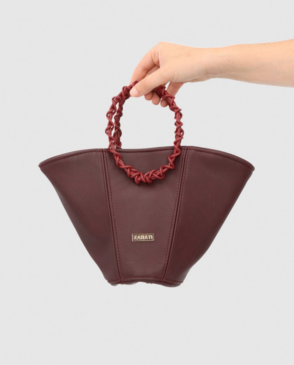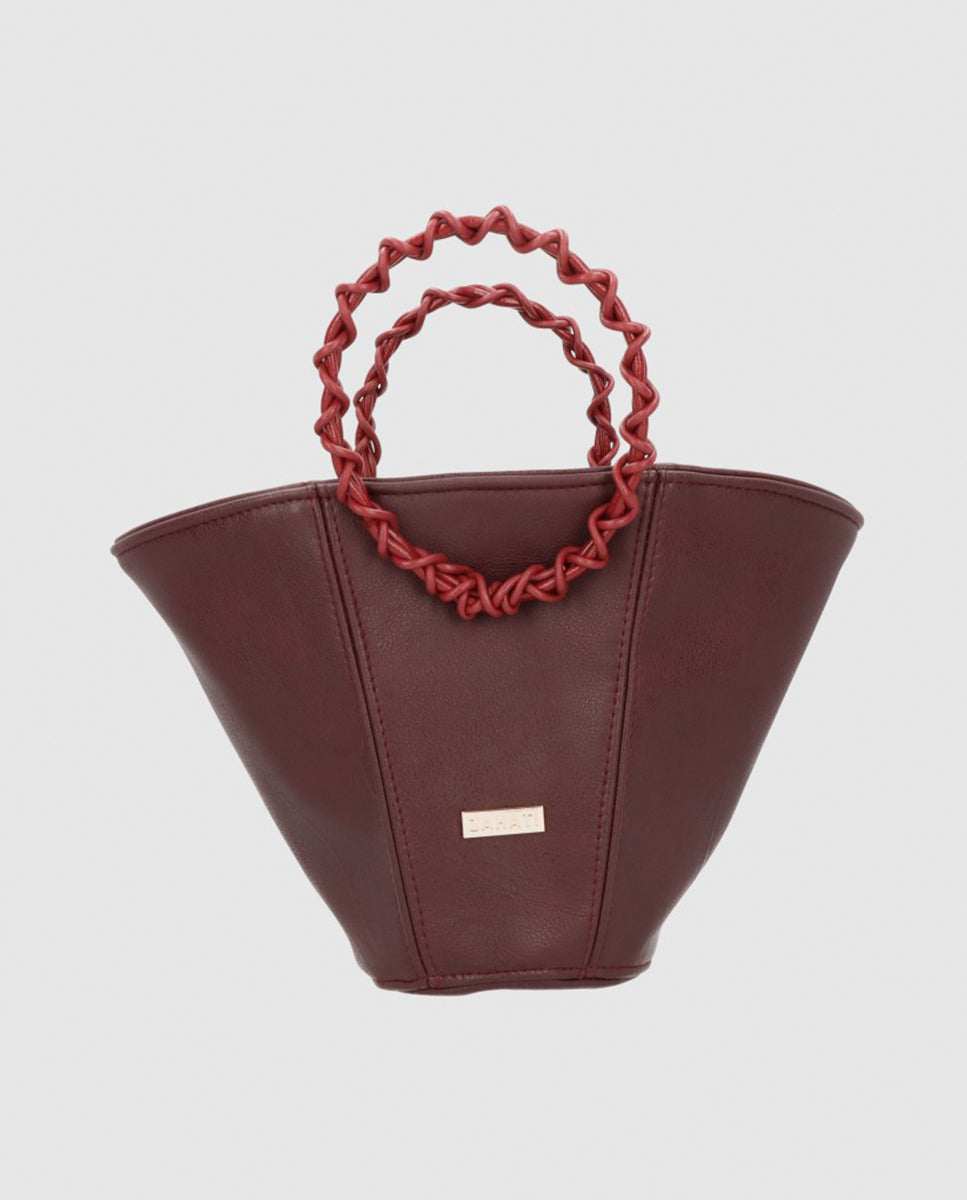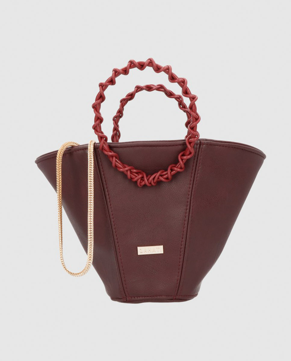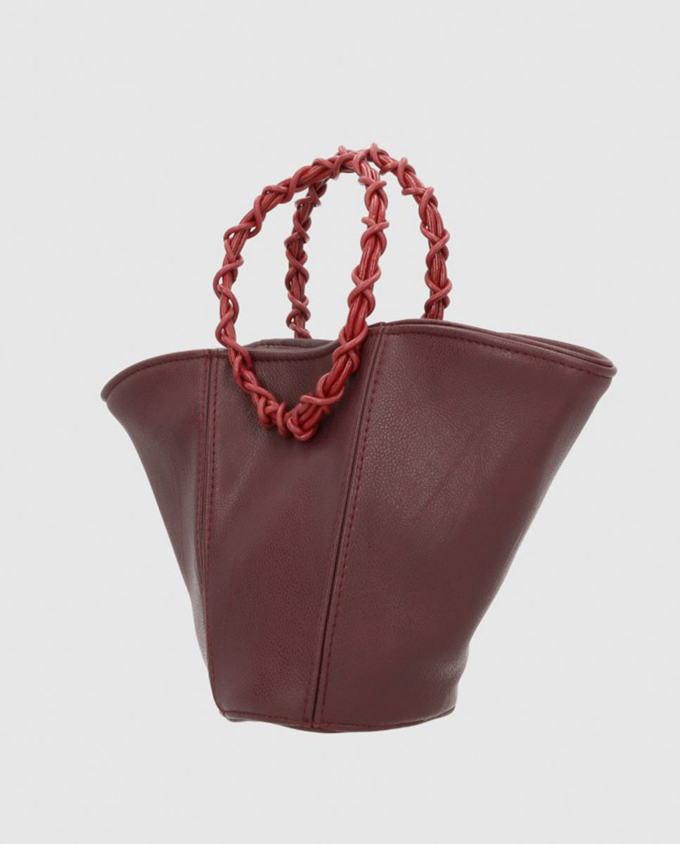 El bolso Poppy está creado con cuero vegetal de color burdeos. El asa de mano está trenzada con cuero natural. Incluye una cadena dorada para poder colgartelo del hombro. El cierre es magnético. Es un bolso ideal de eco leather que además es versatil y podrás usarlo tanto en eventos especiales como a diario.