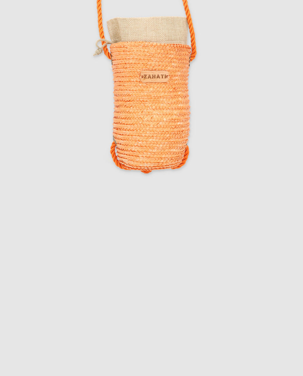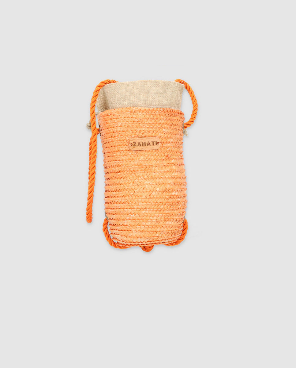 Bolso Tubito realizado con paja natural de trigo. Cada uno a sido teñido con un tinte natural. Está disponible en Naranja. Llevan un cordón de algodón trenzado que te podrás ajustar. En el interior cuentan con un saco de algodón. Hechos a mano en nuestro taller de Gata de Gorgos.