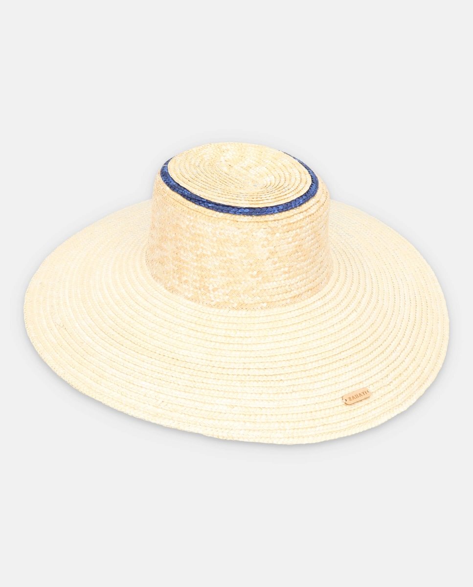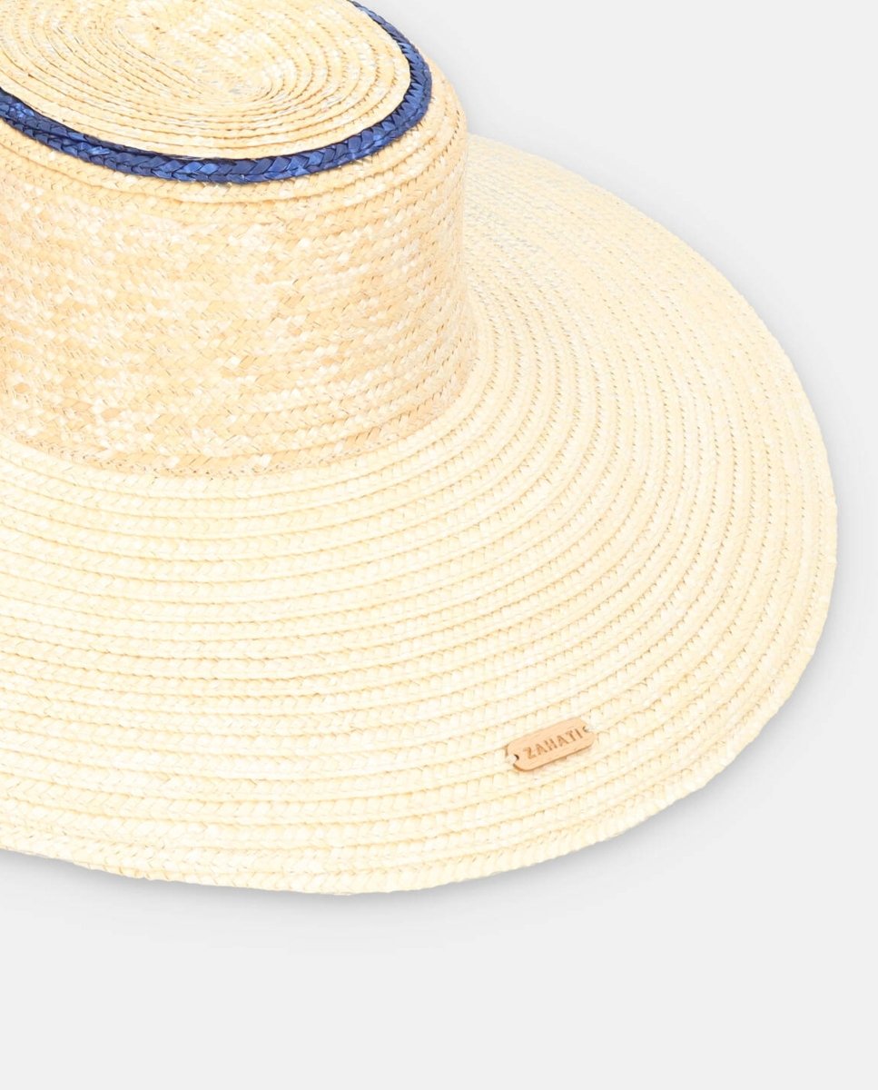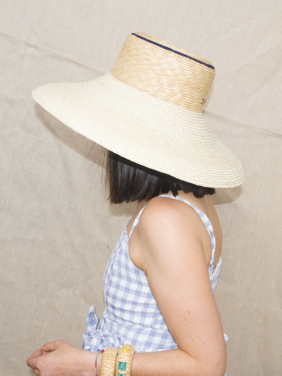La pamela Filipa cuchi tiene el ala en color blanco. En la copa una fina raya azul de paja bordea el extremo. Esta realizada con paja de trigo. Es perfecta para protegernos del sol e ir con estilo a cualquier sitio.