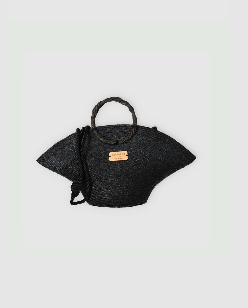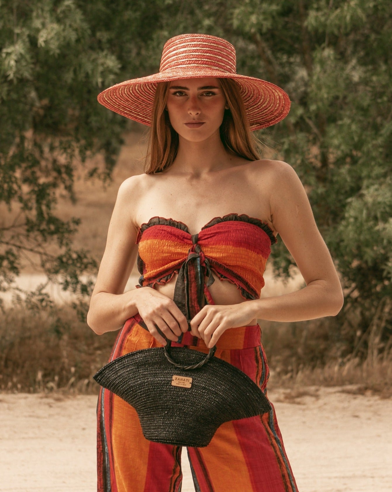El bolso Hatbag es un bolso de mano inspirado en un sombrero. La base del bolso es la copa de un sombrero. Es un bolso ideal y práctico que llamara la atención en cualquier lugar. Lleva una correa de seda trenzada para poder colgartelo. Esta hecho con paja de trigo trenzada a mano y el asa es de medula.