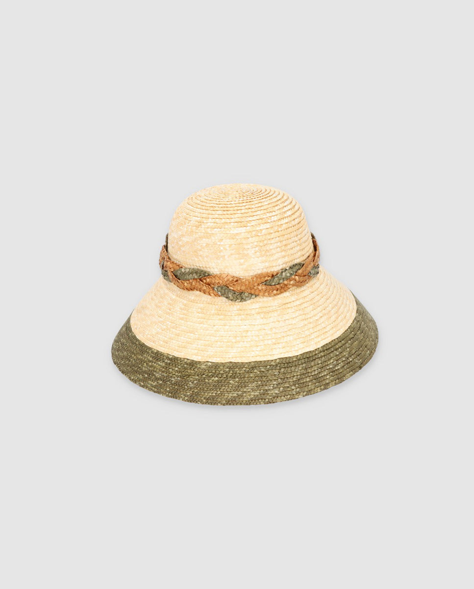 Tiene una trenza artesanal en dos tonos alrededor de la copa.