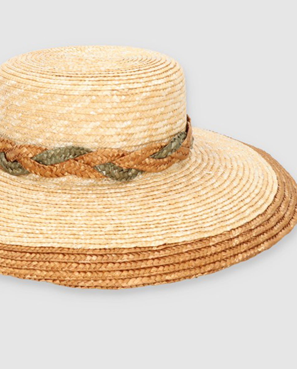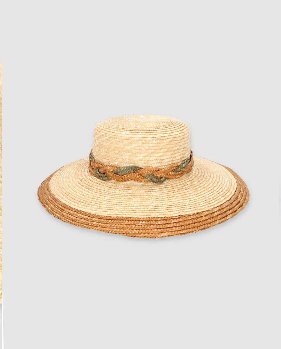 Sombrero de paja de trigo con un trenzado alrededor de la copa del sombrero en oliva y camel. Acabado en color camel Un sombrero pensado tanto para el uso diario como para cualquier evento especial.