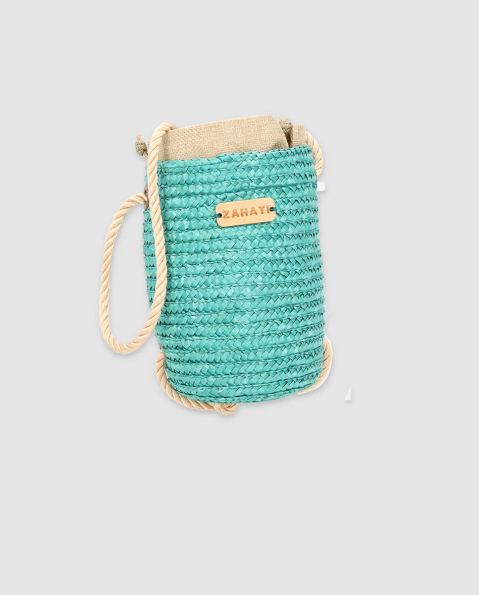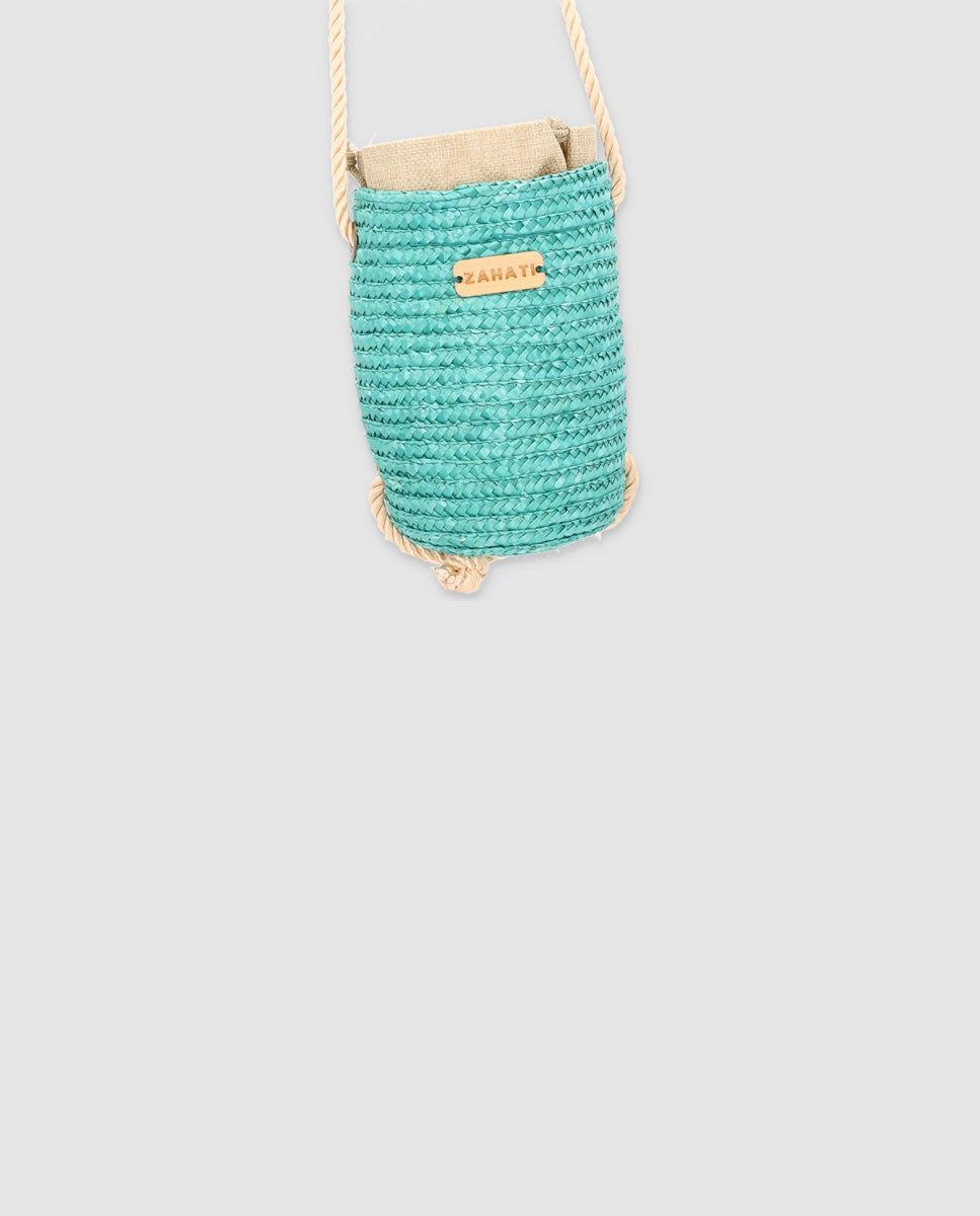 Bolso Tubito realizado con paja natural de trigo. Cada uno a sido teñido con un tinte natural. Está disponible en Verde Agua. Llevan un cordón de algodón trenzado que te podrás ajustar. En el interior cuentan con un saco de algodón. Hechos a mano en nuestro taller de Gata de Gorgos.
